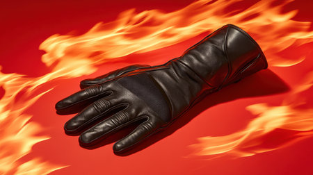 A stunning black leather glove displayed against a fiery red background, embodying themes of protection and allure, perfect for fashion and art projects.