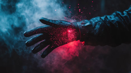 A captivating image of a futuristic glove glowing with vibrant red and blue lights, surrounded by enigmatic smoke, evoking a sense of technology and innovation.