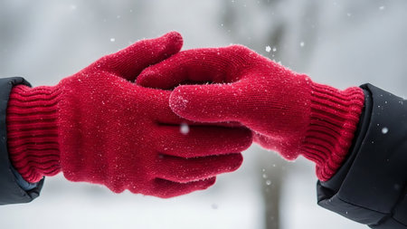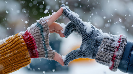 Two gloved hands form a heart shape against a backdrop of falling snow, capturing the essence of love, warmth, and connection in a winter wonderland.