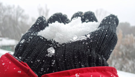 Extreme close-up of intricate snowflakes falling onto a textured, dark gray merino wool glove in har