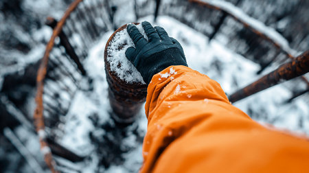 A black winter glove with ribbed cuff and an orange jacket sleeve gently touch a snow-covered, heavily rusted metal post.