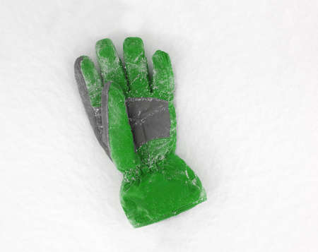 Buried alive. One glove sticking out of a snowdrift with deep blue shadows.