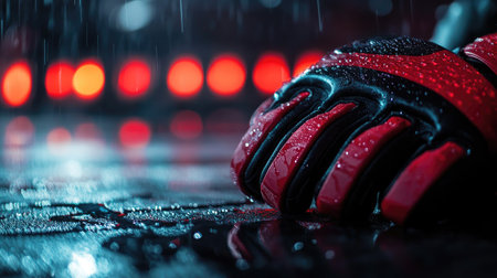 Detailed shot of red and black MMA gloves resting on a mat, with sweat droplets and blurred arena lights in the distance.