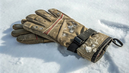Winter's Embrace: A Cozy Scene of Woolen Gloves and a Brown Scarf Resting on Snow in the Park