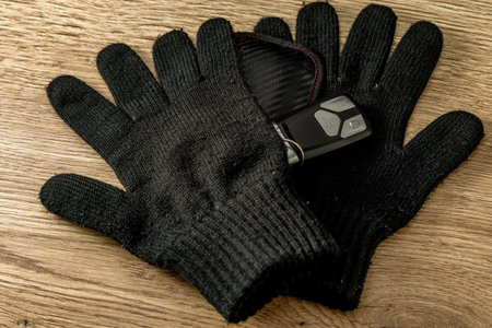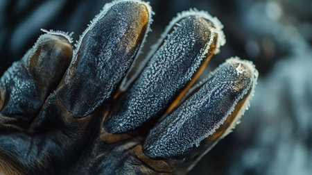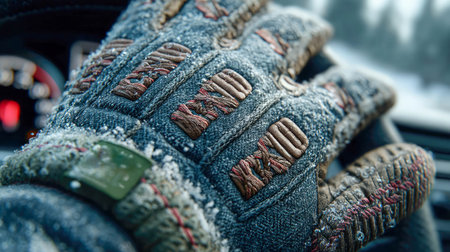 Close-up of a gloved hand gripping a frosty steering wheel, showcasing winter driving gear and icy vehicle interiors.