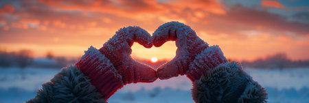 Two warmly dressed hands create a heart shape as the sun sets on a snowy horizon, casting vibrant colors across the winter sky.