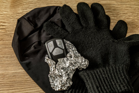 Car thieves, car keys wrapped in silver foil, protection against thieves, car theft with a suitcase, car keys on a black background