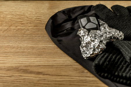 Car keys wrapped in silver foil, protection against thieves, car theft with a suitcase, car keys on a black background