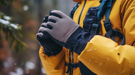 Preparing for a winter hike in a snowy forest wearing gloves and a bright yellow jacket