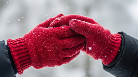 A pair of cozy red knit gloves rests on a blanket of fresh snow, evoking warmth and comfort in a winter setting. Perfect for seasonal themes.