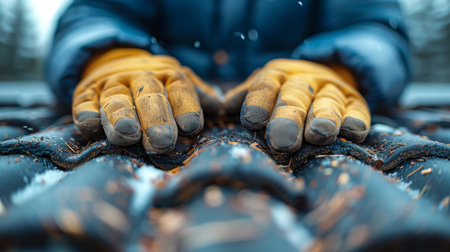 Close up of a worker's hands as they install shingles on a roof, focusing on the details of the professional repair and construction process.