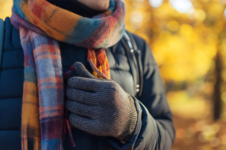 Person wearing a colorful plaid scarf and gloves, enjoying a crisp autumn day. Warm clothing contrasts with the vibrant fall foliage in the background