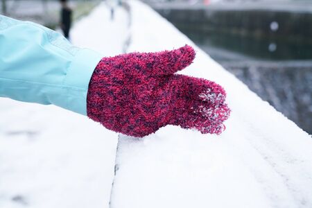 Close-up of hands in red Canada mittens make a snowball from the snow.
