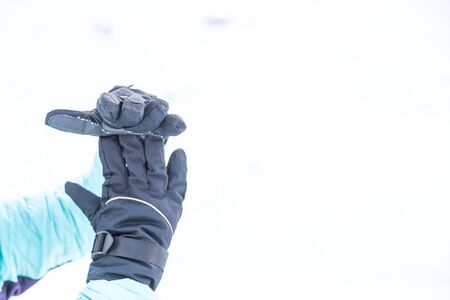 Black skiing gloves in the powder snow at the Hintertuxer Glacier (Tuxer Ferner) in Tyrol, Austria