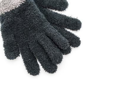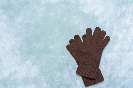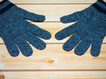 Pair of gloves isolated on the blue background. Dark blue mittens close-up with copy space.