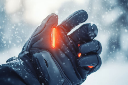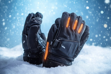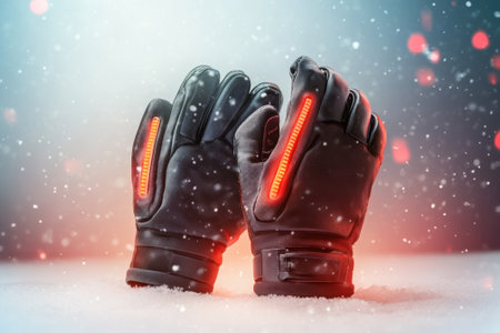 Heated winter gloves rest in soft snow, highlighting their warm glow against the winter scene.