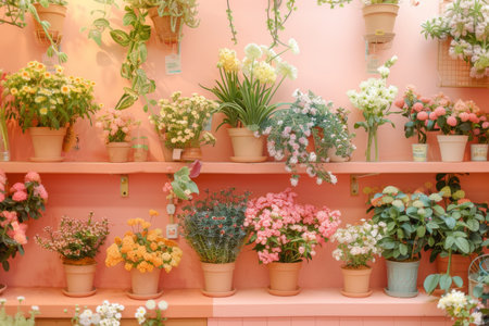 A delightful arrangement of colorful potted flowers fills a charming space, showcasing a variety of blooms against a warm, pastel pink backdrop, inviting visitors to enjoy the beauty of nature.