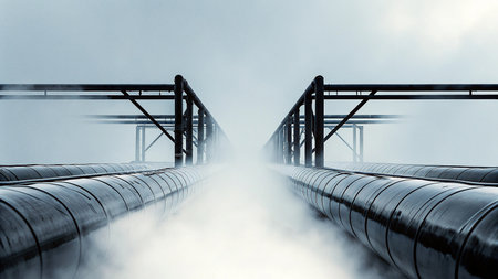 An expansive industrial scene features symmetrical pipelines disappearing into a thick fog, evoking a sense of isolation and modern engineering amidst a muted atmosphere.