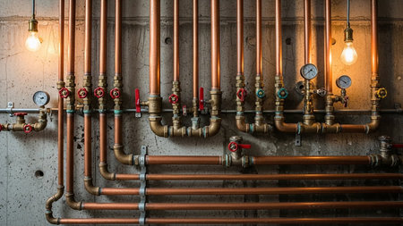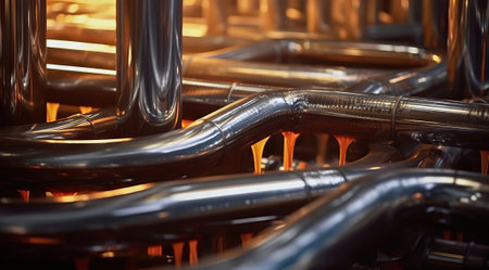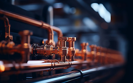 An industrial scene a complex network of copper pipes, valves, and pressure gauges against a rough concrete wall, illuminated by warm light bulbs.