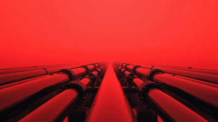 This striking image captures a series of industrial pipes extending into the distance against a vibrant red background, emphasizing depth and symmetry.