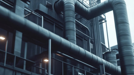 Captivating view of industrial architecture showcasing interconnected metal pipes and structures. This image emphasizes modern design within an urban landscape.