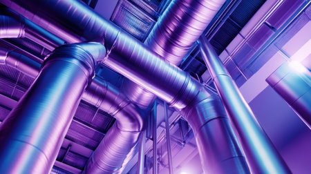 This striking image showcases industrial pipes in a modern facility, emphasizing their sleek metallic design and dynamic angles. The interplay of blue and purple light creates a vivid atmosphere, highlighting the architectural beauty of this industrial setting.