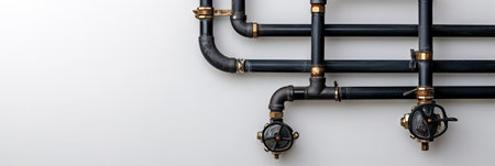 Plumbing pipes on a white wall. Horizontal banner with copy space