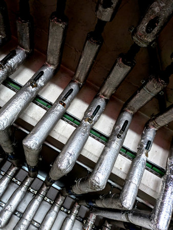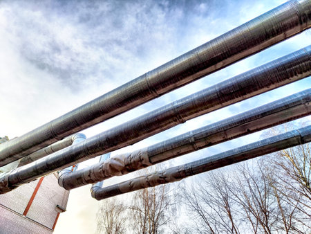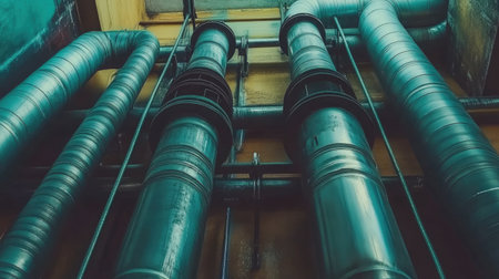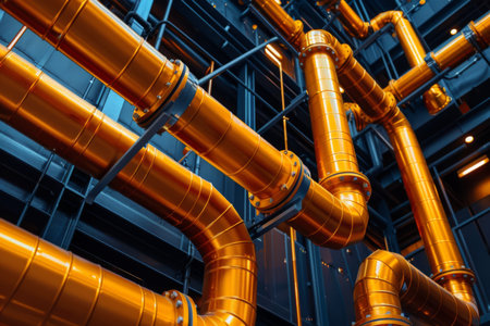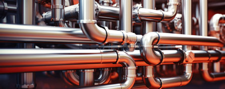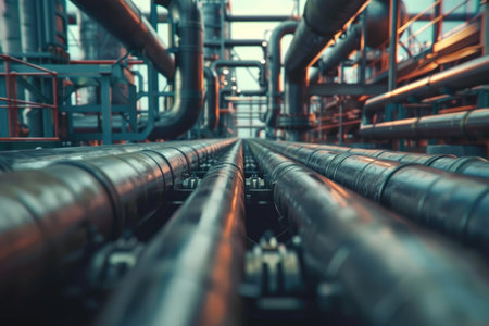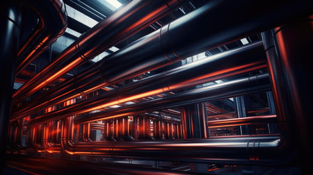 Array of industrial pipes in factory energy facility power plant sewage pipe oil refinery pipe power production chemical manufacturing gasoline gas heat heavy industries modern building
