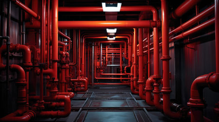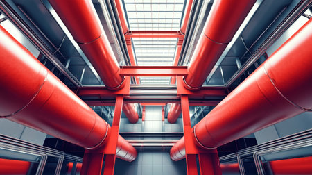 Intricate plumbing system showcasing vibrant red pipes traversing a modern industrial building, highlighting the essential infrastructure