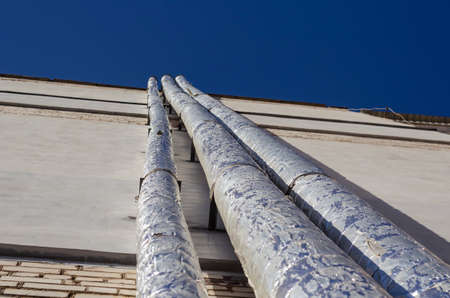 The outer wall of the building with insulated pipes. High brick wall with long pipes. Industry and architecture. Selective focus.