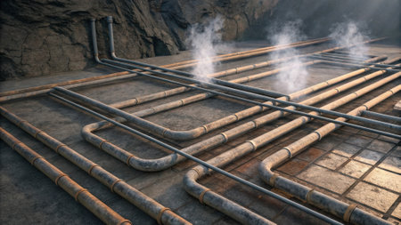 A grid of pipes embedded in concrete distributing heat from industrial processes for later use..