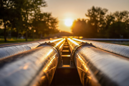 Parallel metal conduits extend toward the horizon, bathed in warm sunset glow, with vibrant foliage lining the scene's edge, evoking tranquility and industrial harmony.