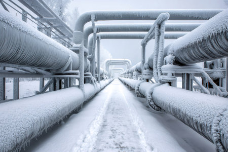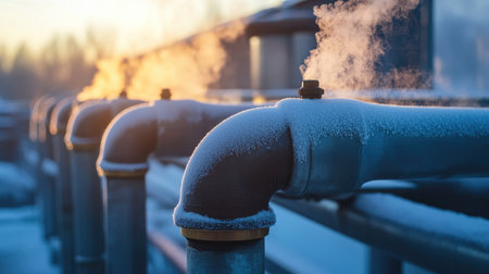 A close-up view of frosted metal pipes releasing steam on a cold winter morning, highlighting industrial operations and environmental dynamics in beautiful light.