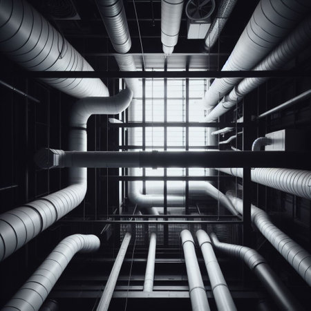 This image showcases a complex industrial pipe system featuring a detailed, monochrome design. It reflects themes of engineering and manufacturing in a modern setting.