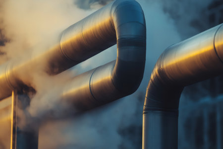Large insulated pipes transporting steam, creating a striking industrial scene in a geothermal power plant during a vibrant sunset