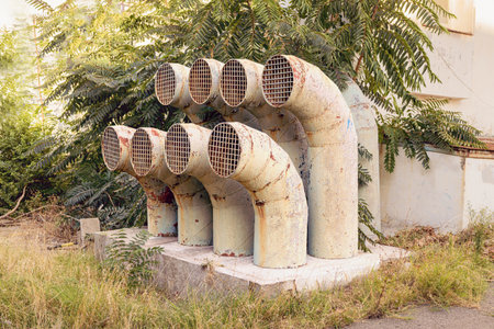 Group of old rusty ventilation pipes with protective grills in overgrown yard. Concept of ventilation system, decay and industrial remains