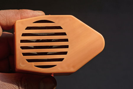 hand holds brown plastic speaker of old radio on black background