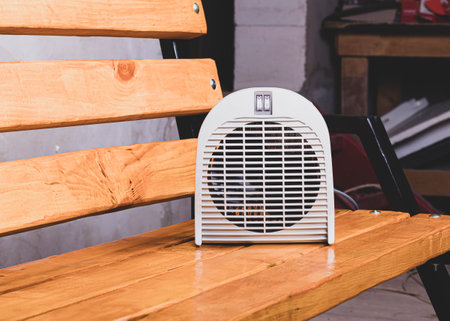 fan heater. the device for home use is made of plastic. on a wooden bench. close up.