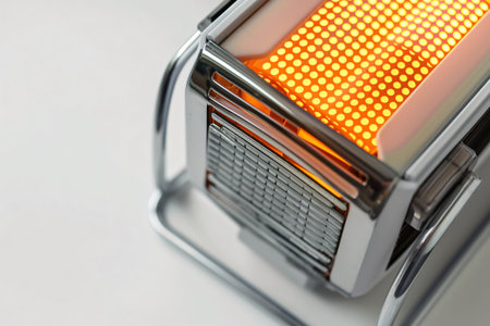 Close up of a portable electric heater radiating warmth on a white background, perfect for staying cozy in winter with a modern chrome design adding style to any space
