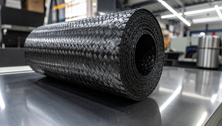Rolls of black carbon fiber in a roll on a conveyor belt