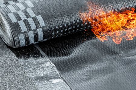 Roof waterproofing, roll roof device with a propane lamp. Construction work, roof repair