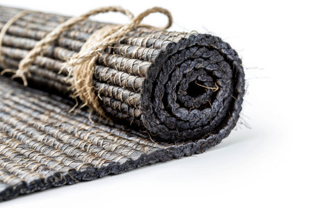 close up of a rolled up black yoga mat on a white background