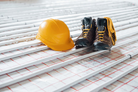 Shoes and hard. Pipes of underfloor heating system. Close up view. No people