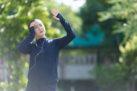 Portrait of Asian woman was sick with headache at park listening to music. Woman exercise at park was sick with headache.