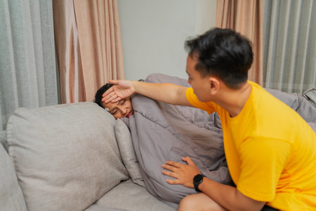 Image of sick girl getting check up by her friend while sitting on the sofa