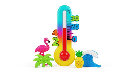 A cheerful, cartoon-style thermometer with a Celsius scale is presented on a white background, surrounded by iconic tropical A bright pink flamingo, a green palm tree, a yellow pineapple, and a blue wave complete the summery scene. The thermometer itself a vibrant gradient of yellow, orange, pink, and blue, with a red liquid column indicating a temperature. evokes a strong sense of summer, heat, and vacation.