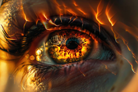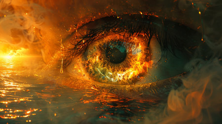 Close up of a human eye with a fiery orange glow, surrounded by flames, creating a dramatic and intense visual effect