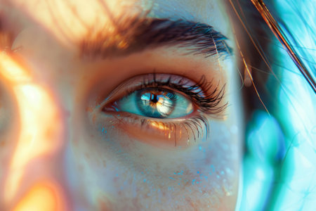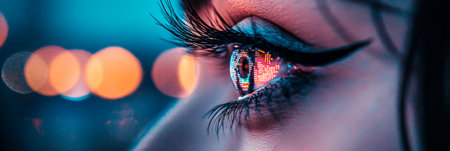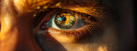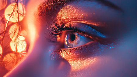 A close-up view of a human eye with shimmering details, warm bokeh light reflecting in the eye, symbolizing vision, focus, and insight in a creative and futuristic setting.