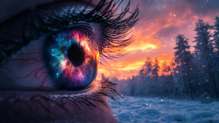 Close-up of an eye with a cosmic galaxy reflection against snowy forest at sunset, vibrant colors. Surreal imagination and nature concept