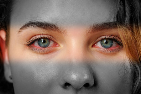 a close up of a womans eye with red eyes